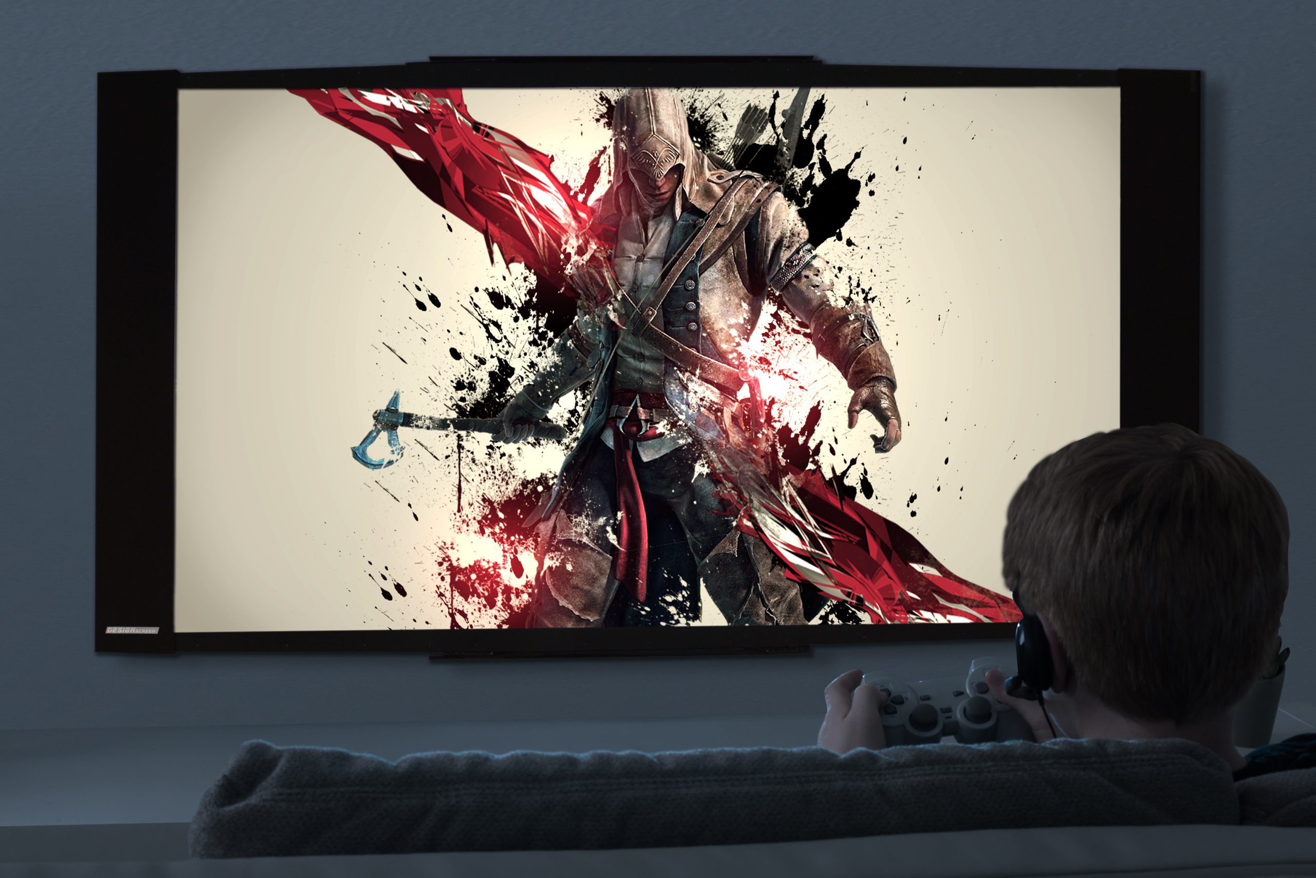 Pendant que chaque gamer s’immergeait dans le jeu en réalité virtuelle, le public a enfin pu partager les sensations du jeu grâce à une projection en Haute Définition sur un écran de 221cm de diagonale, finis les petits écrans de PC ! 1er écran gris pour gamers permettant de projeter en Haute Définition et en lumière ambiante, sur très grand écran de 87 » et sans fatigue visuelle grâce à l’absence de rayon bleu des téléviseurs traditionnels.